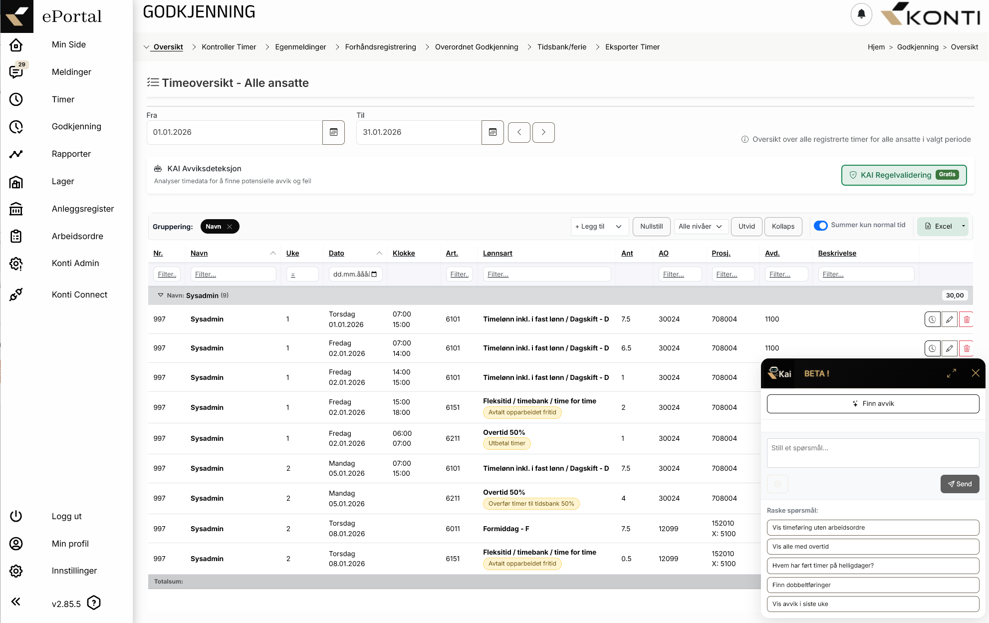 Enkel timeregistrering med full kontroll for den ansatte og lønnsavdeling. Håndterer automatisk hovedavtalen og lokale særavtaler for vakthåndtering og timebanker.